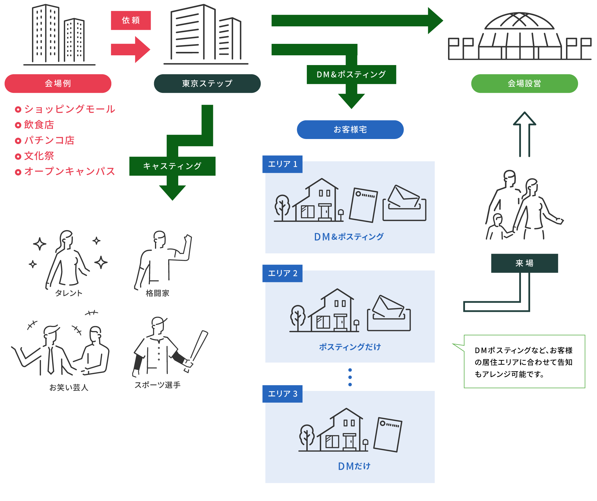東京ステップでは、スポーツイベントの企画を数多く手掛ける当社ならではのスタンスで、イベント運営やチケット販売を行っており、プロレス会場でのアンケートの実施など、マーケティングの一環としてもご利用いただいております。また、東京ステップは、前売り.comを運営し、様々なイベントを支援しております。